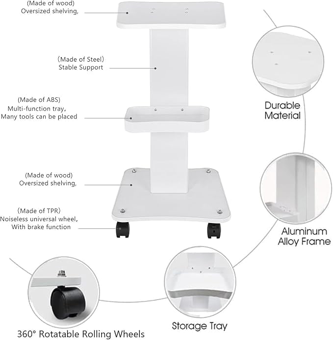 - Versatile Storage: This three-tier beauty cart offers spacious storage for small beauty instruments, oxygen injectors, microdermabrasion machines and more with its large top tray and two adjustable shelves.